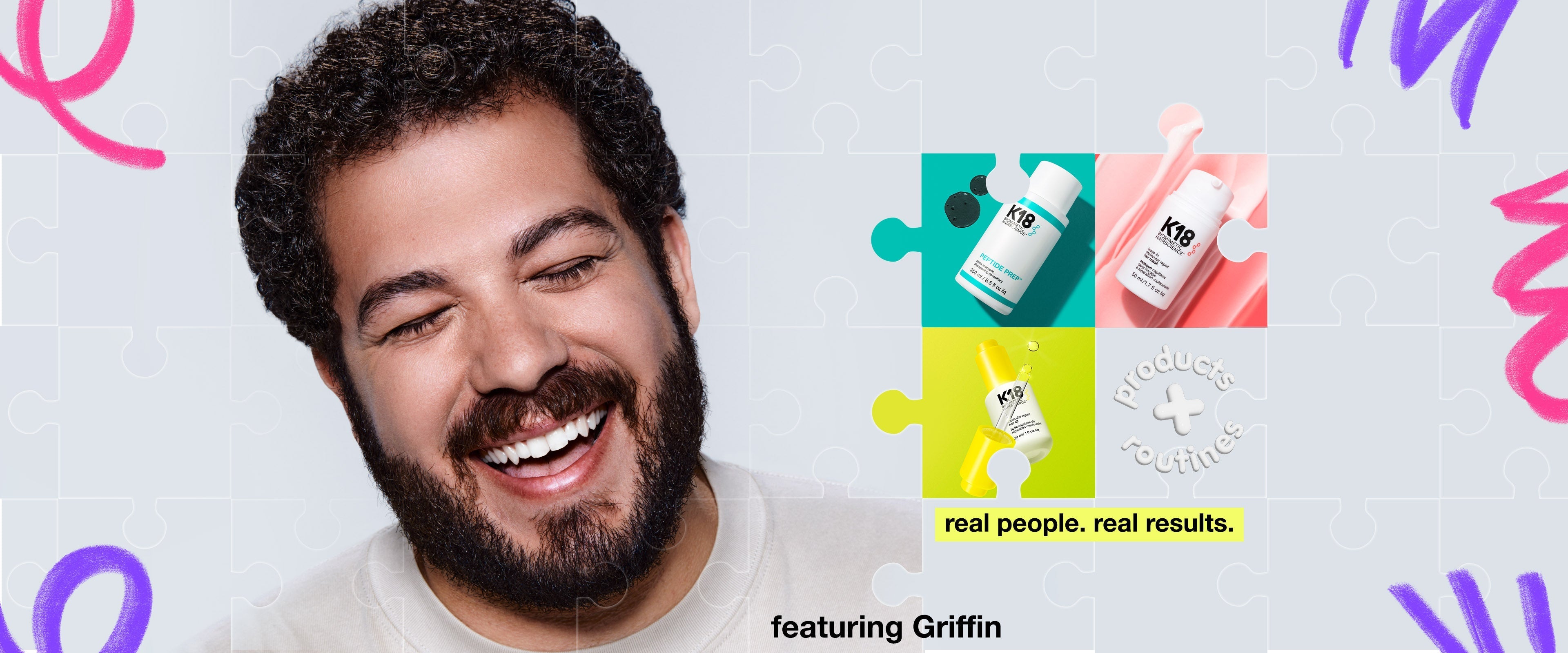 Without doing much to his hair, Griffin faces environmental irritants like UV rays, pollution, and hard water. This wreaks havoc on his crown, weighing down and damaging his curls + coils. To tackle daily damage, Griffin trusts K18 to deliver what hair needs to be healthy. Watch to see his real people, real results routine: