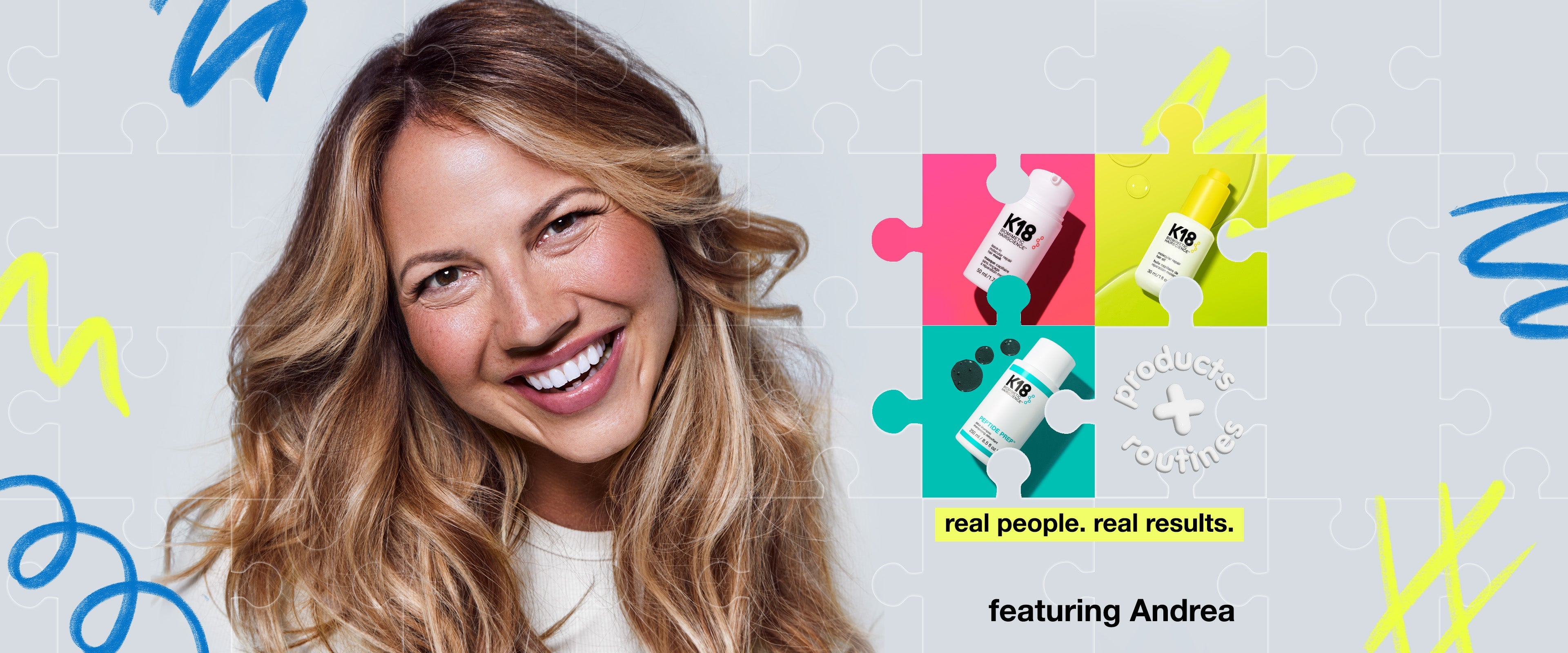 In the salon, Andrea’s stylist makes her hair goals a reality thanks to K18REPAIR™. This damage repair duo restores hair strength + elasticity before and after bleaching and extensions installation. At home, she uses the detox shampoo to wash weekly without stripping her color. To maintain her hair strength through extensions, she uses the K18 leave-in molecular repair mask to reverse damage in 4 minutes. Then, Andrea preps for heat styling and adds shine with the molecular repair hair oil