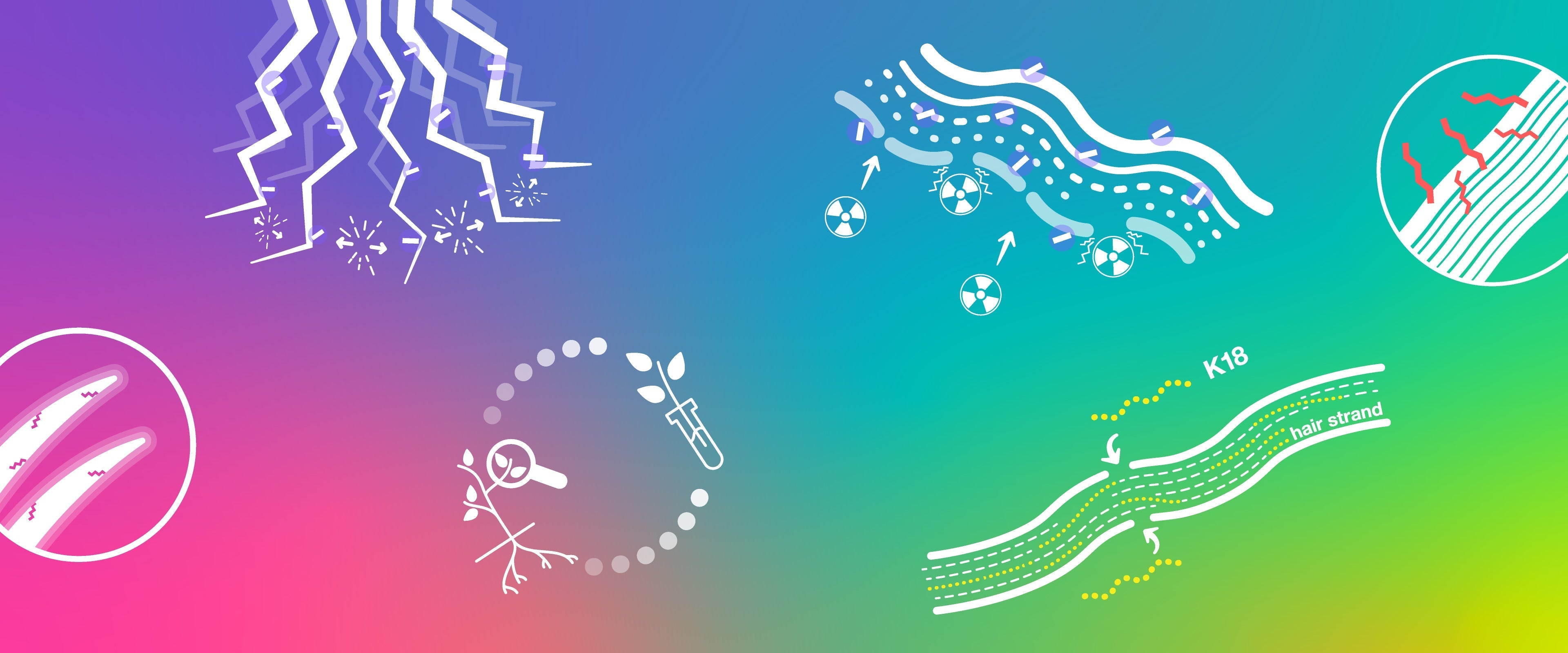 When hair undergoes chemical processing or bleaching, the keratin chains running along the y-axis of hair break, and as a result, hair loses its resiliency. To restore strength and elasticity of damaged hair, you must repair breaks along both the x + y axis.