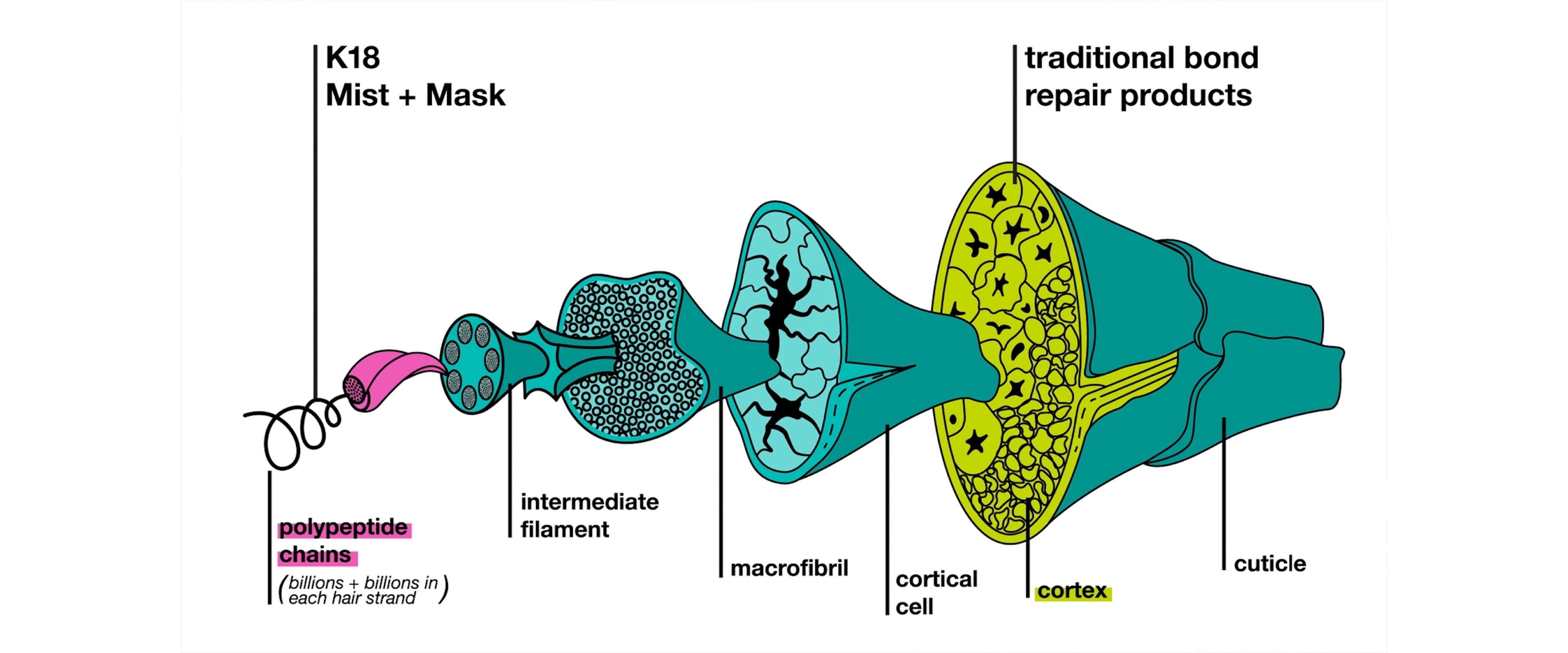 Our answer to that is our special bioactive peptide, K18Peptide™. Traveling deeper into the inner layers of hair than traditional repair products, our revolutionary peptide is just the right size and makeup to fit in and reconnect those broken keratin chains. And because our peptide is a bit of an overachiever, as a result of this reconnection, any disturbed disulfide bonds are also re-conformed.