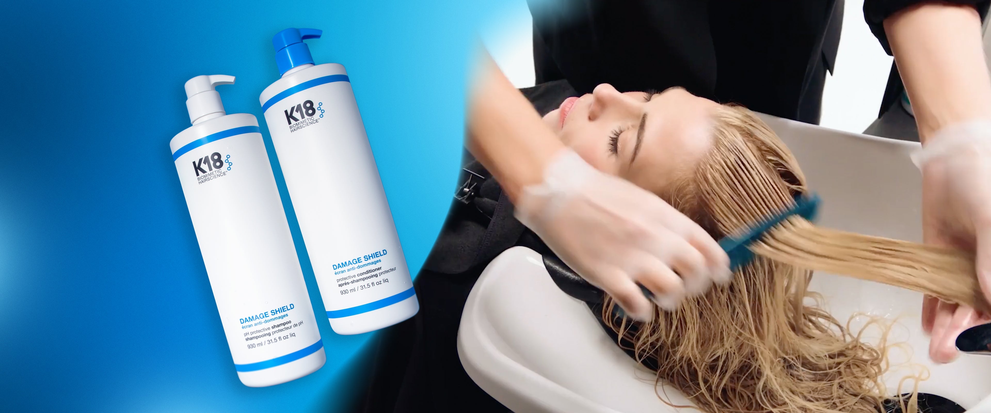 Wrap up with K18 DAMAGE SHIELD pH protective shampoo to gently cleanse and enhance shine without stripping. Finish with K18 DAMAGE SHIELD protective conditioner again to protect your client’s hair for up to 3 days.