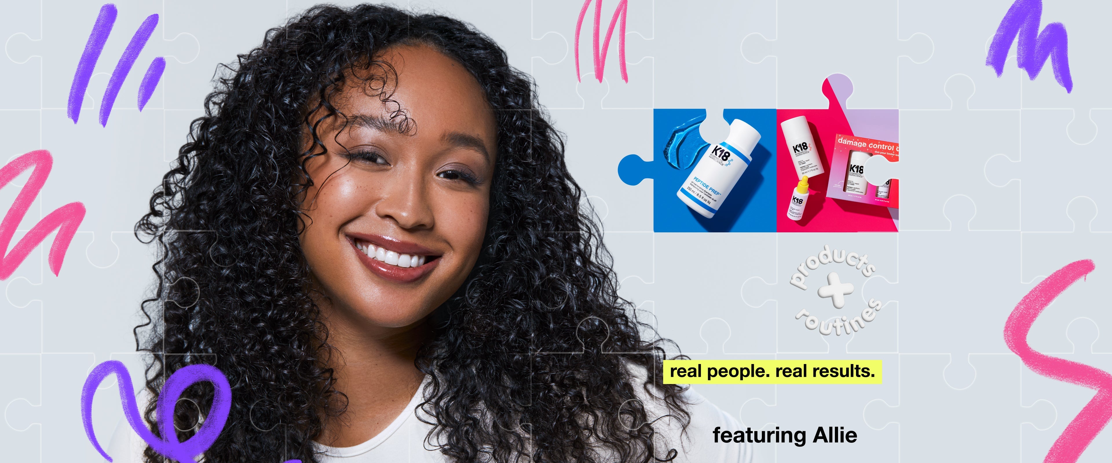Allie starts her healthy curl routine by creating a clean canvas with the dailyDAMAGE SHIELD pH protective shampoo . To reverse damage from keratin treatments and heat styling, Allie reaches for the K18 molecular repair mask and molecular repair hair oil. With clinically proven damage repair in her routine, she can smooth, fight frizz, and protect from heat in minutes.