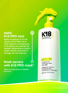 2. Aplique un mínimo de 10 pulverizaciones completas de bruma capilar reparadora molecular profesional K18 por cuadrante, aumentando hasta 20 pulverizaciones según sea necesario, dependiendo de la longitud, la densidad o el nivel de daño del cliente.