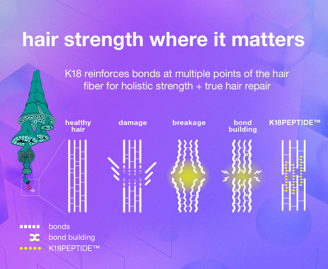 K18PEPTIDE™ repairs hair at a molecular level across multiple types of bonds including polypeptide chains and disulfide bonds to reverse damage from bleach, color, chemical services, and heat*. Developed through biotechnology, the K18PEPTIDE™ is optimized for human biology and uniquely matches and clicks into hair’s keratin structure, reconnecting damage sites at the molecular level, K18PEPTIDE™ delivers durable repair for all hair types, restoring strength and elasticity.
